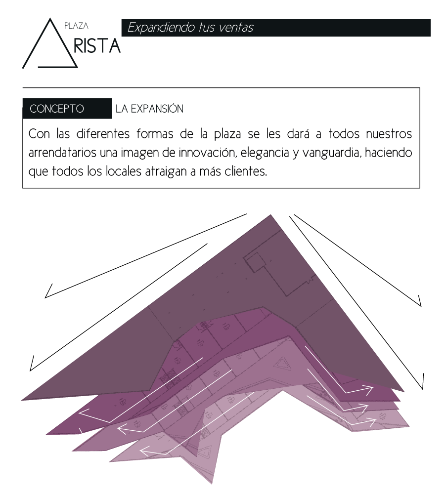 Como premisa se usó el concepto de la expansión. Las diferentes formas de la plaza darán a todos nuestros arrendatarios una imagen de innovación, elegancia y vanguardia, haciendo que todos los locales atraigan a más clientes.